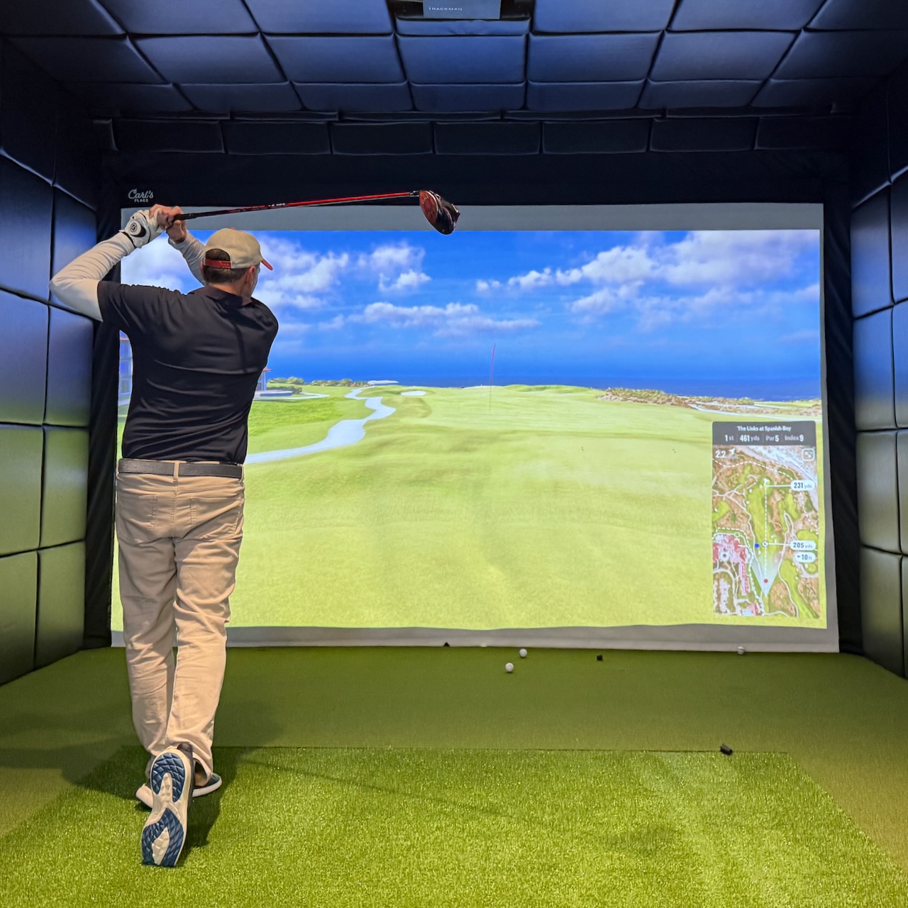 Watch the ball track through the air like you’re watching a PGA tour event and then look up to see an array of data about your shot presented on a large flatscreen display.